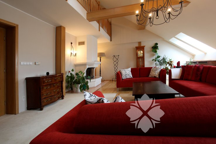 Large three-bedroom duplex apartment size of 200 m2 with terrace size of 12 m2 with view to Prague Castle situated on the fifth floor of the building with reception. Apartment is fully furnished. The lower level of the apartment offers entrance hall, guests bedroom with home office and bathroom. Further separated fully equipped kitchen with dining area and living room with fire place. In the upper level you can find two separated bedrooms with ensuite bathrooms. From master bedroom there is a direct access to the terrace with south-west orientation. Apartment is fully air-conditioned.