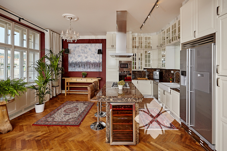 On the first floor there is a very nice, spacious apartment of 177 m2. It has high ceilings over three metres and tall windows which are offering wonderful views of the the park and Vltava River.